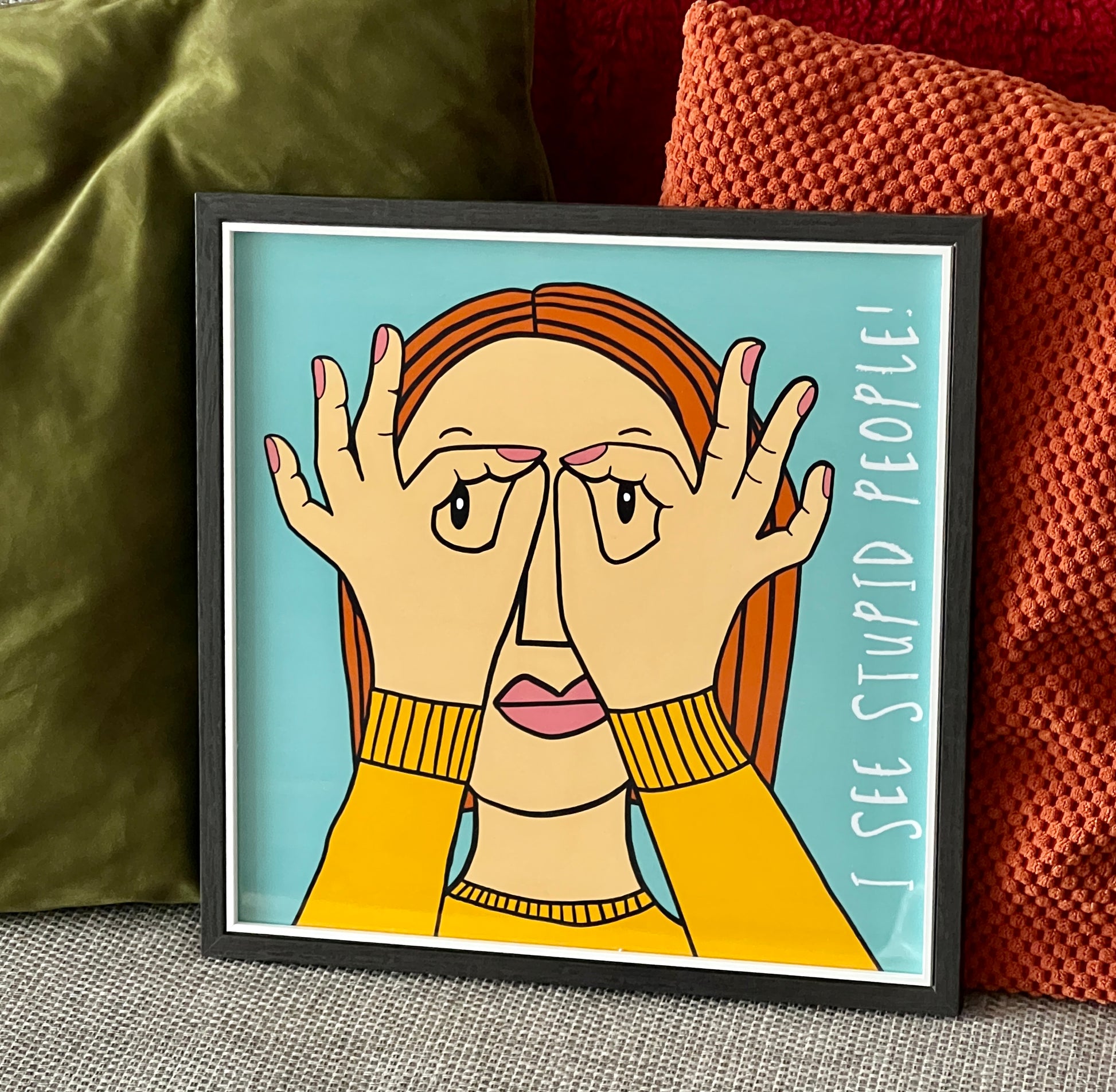 This print is digital artwork. The colour palette has a retro feel with a retro blue background that matches the humour of the print. It was inspired by my sister's description of a video she watched. It hangs in my art studio and makes me laugh. I hope it brings you as much joy.